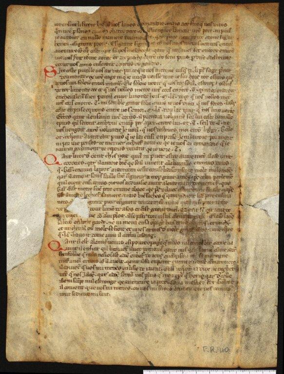 Der Tristan in Prosa, dessen erste Ausgabe auf das dritte Jahrzehnt des 13. Jahrhunderts zurückreicht, ist der erfolgreichste Roman in der Langue d’oïl im gesamten Mittelalter. Er verarbeitet mit Hilfe einer Technik der Verschachtelung zahlreicher Episoden die Sage von Tristan und Isolde und ihrer gegenseitigen konfliktgeladenen Liebe, die durch die ungewollte Einnahme eines Liebestranks ausgelöst wurde, eine Geschichte, die schon in Frankreich in den Versen von Thomas d‘Angleterre und des Normannen Béroul herausragende Sänger gefunden hatte. Auch in Italien war der Tristan in Prosa der Artusroman, der am meisten im Umlauf war. Neben einer ersten Verbreitung in der Toskana stießen Tristans Abenteuer auch in Venetien auf ein großes Echo. In diesen weiten Rahmen reiht sich das Udineser Fragment ein, dessen Blätter als Deckblatt für Notarprotokolle von Lorenzo di Domenico von Lovaria, Notar in Udine (1457-58), dienten. Im Unterschied zu den anderen norditalienischen Exemplaren gehört das Fragment aus Udine zur selben Gruppe, zu der die westtoskanischen Handschriften gehören und von der auch der sog. venezianische Tristan abhängt. Die besondere sprachliche „facies“ des Fragments verweist auf einen Text, der ausgehend von einem älteren Exemplar vermutlich aus der Westtoskana letztendlich von den „scripta“ der französischen Texte beeinflusst wurde, die in der ersten Hälfte des 14. Jahrhunderts in Norditalien, wahrscheinlich in Venetien, abgeschrieben wurden.