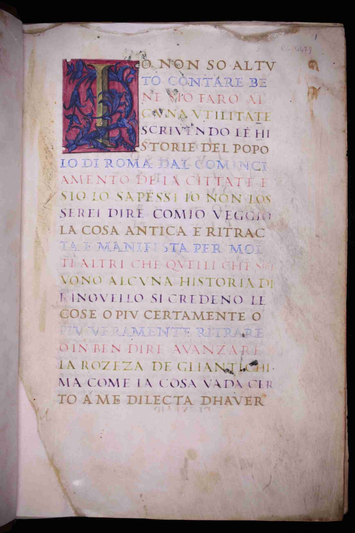 The fourteenth-century Livy’s first decade translation into Italian vernacular drawn up in 1323, at Andria (Apulia), by the notary Filippo di Santa Croce, not directly from the Latin original, but from a nowadays lost French translation, was quickly widespread in Tuscany and Veneto. Thanks to the studies of the English scholar of Humanistic culture and Renaissance, Albinia de la Mare (1932-2001), the manuscript has been attributed to the calligraphic and figurative art of Bartolomeo Sanvito of Padua (1435-1511), the greatest promoter, together with Felice Feliciano from Verona, of the ‘libro all’antica’ (old-fashioned book) featuring a peculiar recovery of refined decorations in an antiquarian style. This codex of Udine also shows the skilfully played alternation of differently coloured script lines and, at the opening of each book of the decade, the presence of coloured epigraphic capital initials with a strong chiaroscuro rendering and a decoration of vegetal interlaces. The codex got into the Seminary Library of Udine through the legacy of Francesco Maria Cernazai from Udine (1802-1881), owner of a rich collection gathered by inheritance from his father Giuseppe Carlo and his brother Pietro, both bibliophiles.